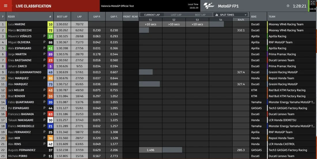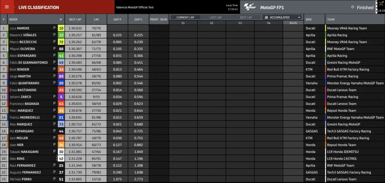 Credo non abbiano messo le fotocellule per la Speed Trap.non sono usciti i dati delle velocità massime ma qui a Valencia farebbero poco testo. Comunque pare che Marmorini abbia fatto un gran lavoro, anche Crutchlow diceva che il motore 2023 è un missile. Italians do it better, c'è poco da fare.
