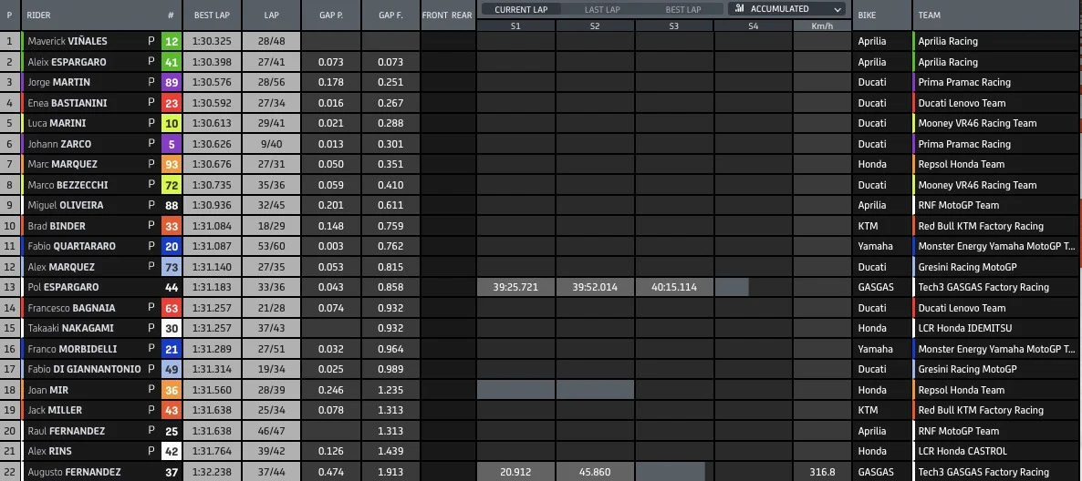 13.05 Si avvicina la pausa pranzo, rallenta l'attività in pista, Le due Aprilia sepre davanti a tutti, tempi invariati.