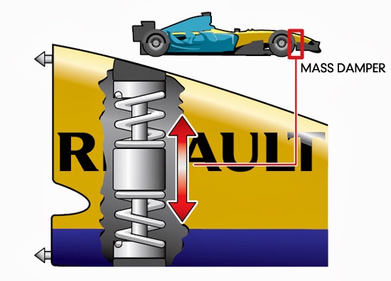 Un mass damper non è necessariamente un dispositivo attivo come quelli che si usavano in F1, ma è in generale uno smorzatore di vibrazioni Tanto per fare un esempio banale, il contrappeso che si mette sui cerchi per l'equiliratura può essere considerato un mass damper