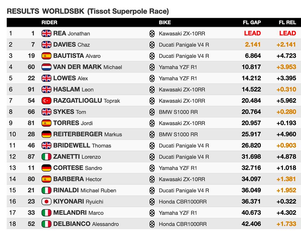 Vince Rea con 8 secondi su Butista, terzo Razgatioglu davanti a VD Mark, Haslam, Melandri, Lowes, Rinaldi e Zanetti. Fantastico Rea oggi, uno spettacolo vederlo guidare qui.
