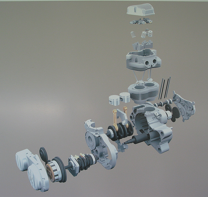 oggi l'ho vista dal vivo. E' certamente un motore molto particolare. Unisce soluzioni completamente antiche ad altre raffinate. Il cambio e' estraibile ma non separato, nel senso che non si stacca un cambio intero come nelle HD o nelle vecchie inglesi. Il carter che resta nel telaio e' unico per cambio e albero motore. TUttavia resta separato a livello di olio che e' diviso dall'olio motore.Primaria a ingranaggi, quello sull'albero motore e' enorme rispetto al solito. Si gioca tutto su carter laterali che permettono di estrarre tutto lasciando il carter principale nel telaio. E' molto diverso dalle vecchie inglesi dentro, anche se sembra simile fuori.TUtti gli organi e i carter sembrano molto sovradimensionati , con ampi spazi vuoti, quasi che sia una scelta stilistica.