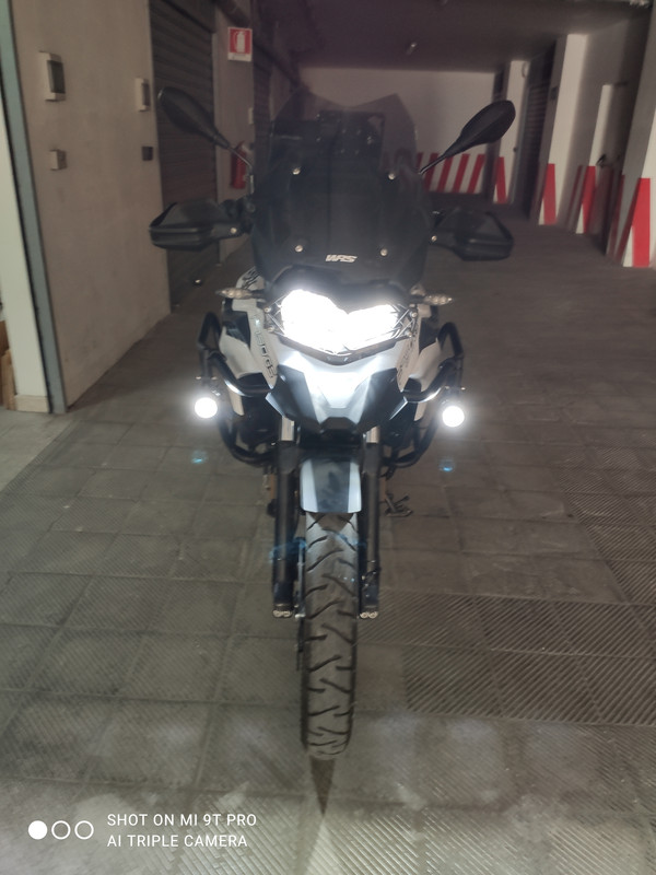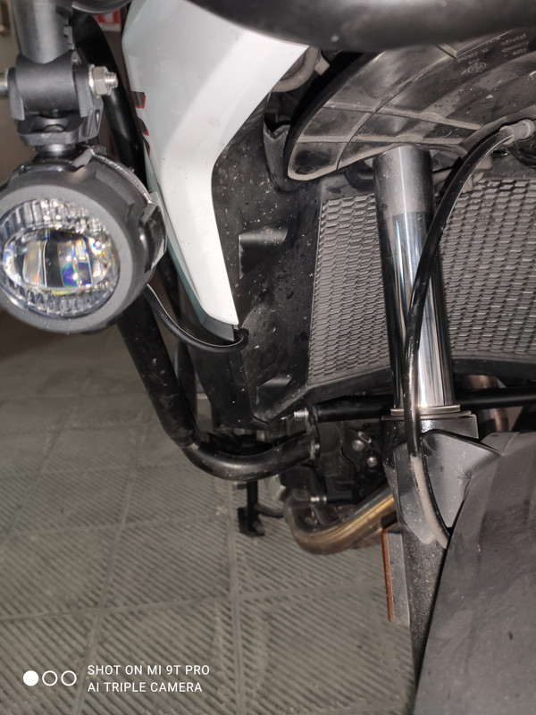 - mi sembrava più sicuro (per i faretti) che fossero protetti all’interno dei crash bars sia in caso di una eventuale scivolata, sia in caso di urto con qualcosa. Già la moto si allarga, con i faretti messi esterni dovevo stare ancora più attento nel traffico o nei passaggi stretti tra i paletti che in città capita di trovare.