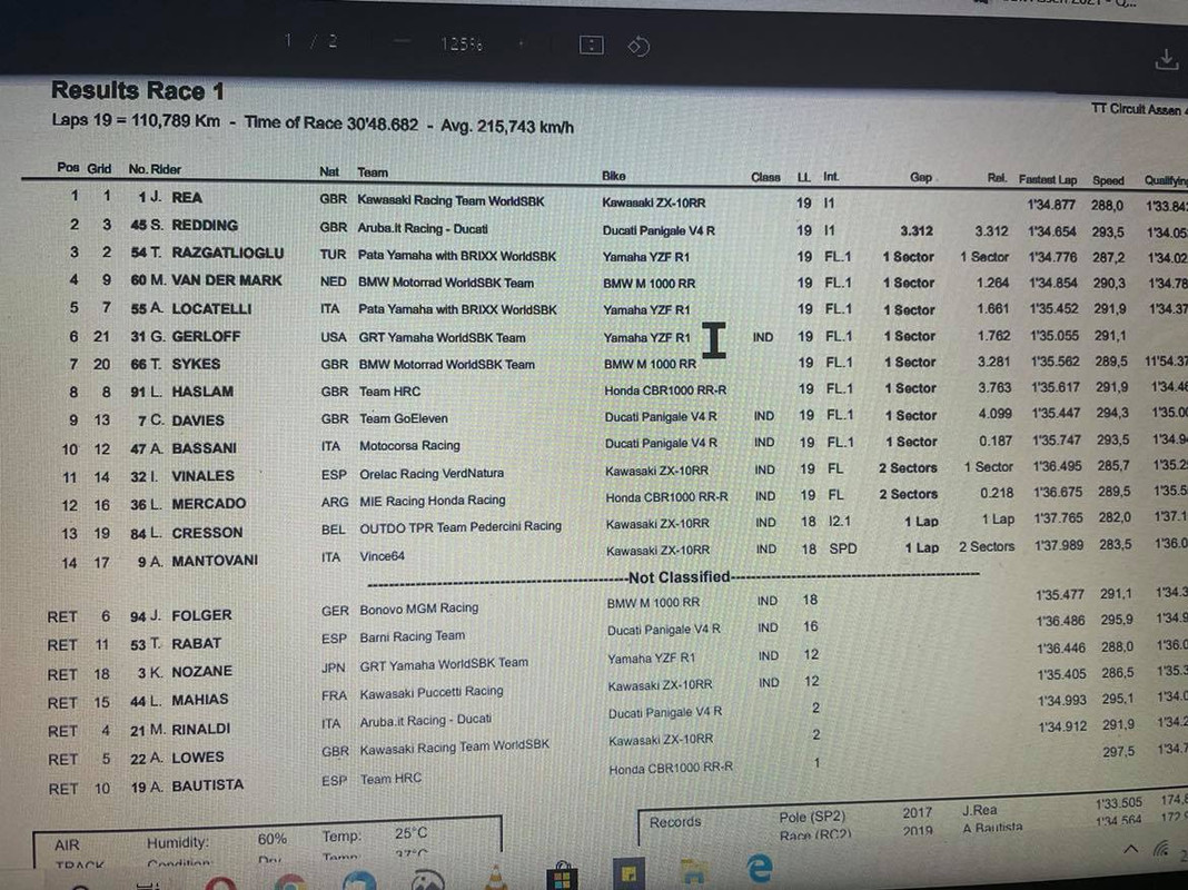 Rea unico a scendere sotto 1,34 ma i due limitano il distacco ad un paio di decimi. Seguono Rinaldi, Lowes,Folger, Locatelli, Haslam, Van Der Mark e Bautista. Ancora una volta brutta qualifica per Davies, solo 13mo.