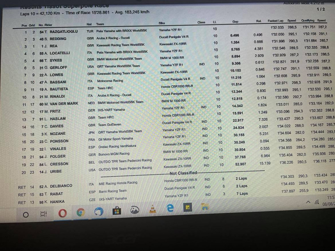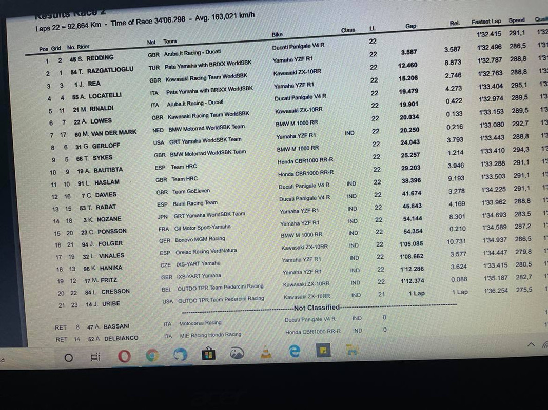 Gran gara dell'inglese che si rivela imprendibile anche per Razgatioglu mentre Rea non ha voluto prendere rischi chiudendo con un terzo posto sufficiente a mantenere la leadership in classifica generale per soli tre punti sul turco della Yamaha. Di fatto anche Redding ora è tornato in lizza per il titolo.