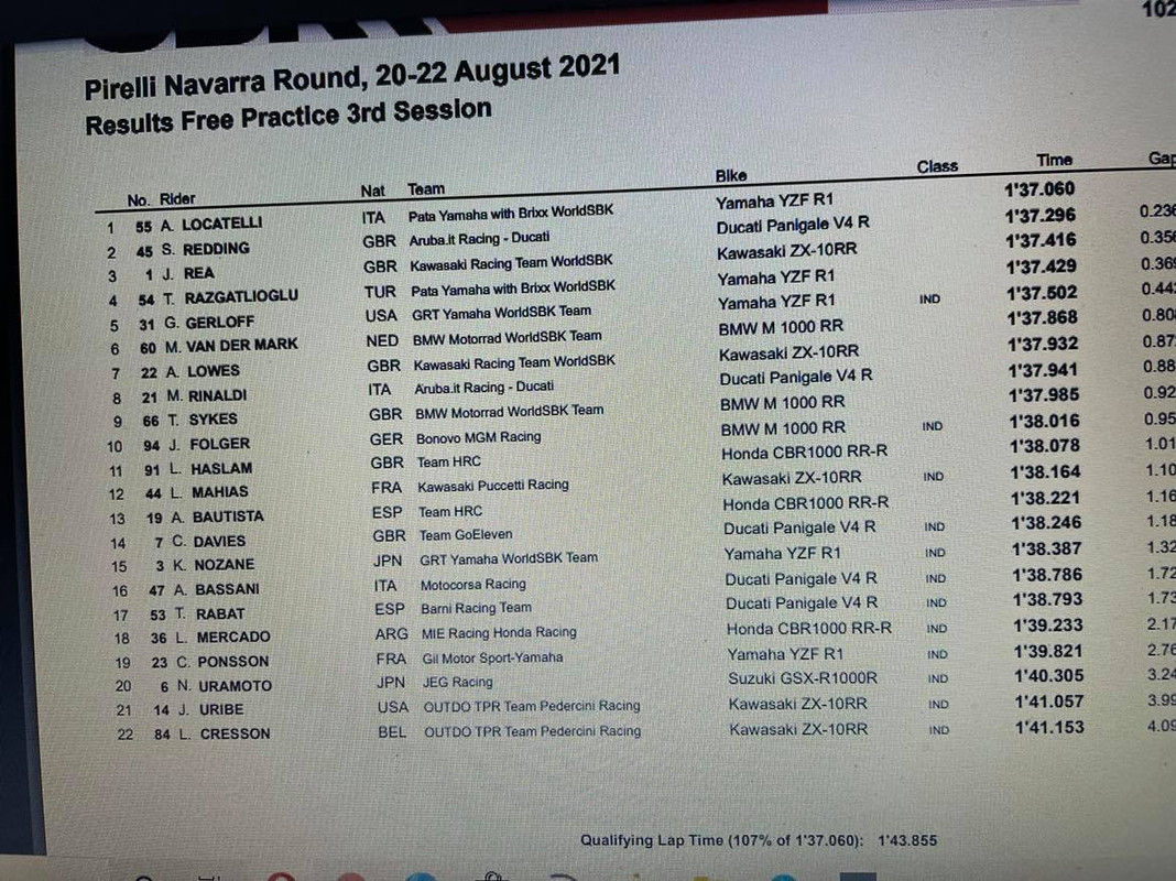 Strepitoso Andrea Locatelli che continua a stupire chiudendo al comando la terza sessione di libere col crono di 1.37.060 davanti a Scott Redding e Jonathan Rea. Seguono Razgatioglu, Gerloff, Van Der Mark, Lowes, Rinsldi, Sykes e Folger.