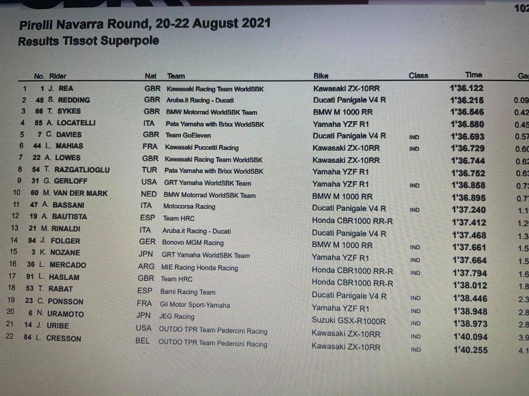 Nessuno riesce aa fare meglio di Johnny anche se Redding si è avvicinato moltissimo. Sykes chiude la prima fila mentra dalla seconda linea col quarto tempo scatterà andrea Locatelli che precede Davies ed un ottimo Mahias. Razgatioglu ottavo partirà dalla terza fila.