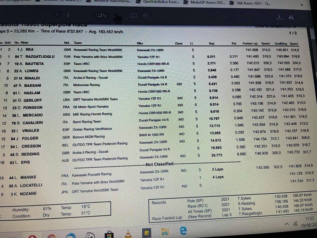 Intanto ci si avvicina a metà gara con Rinaldi che mantiene mezzo secondo di vantaggio su Razgatioglu mentre Rea ha perso contatto ed è insidiato da Locatelli e Bautista.