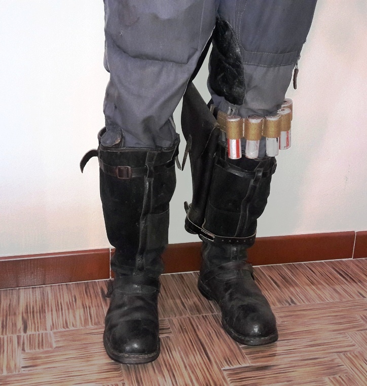 Il mio pilota ha la fondina per la pistola di segnalazione allacciata alla cartuccera al polpaccio sinistro (come documentato da foto dell'epoca):