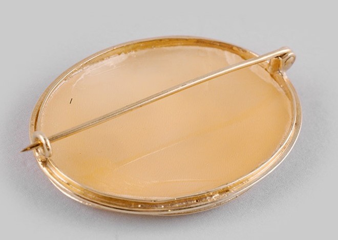 Incisione in osso, cornice ovale in oro 14 carati. 43,2 x 33 mm.