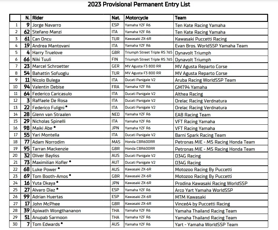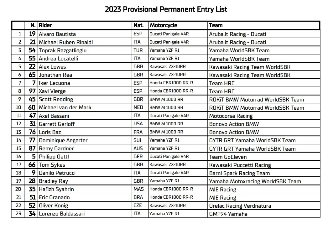WSBK e WSSP - Le Entry List 2023