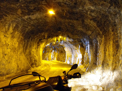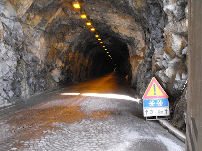 Dopo un paio di km cominciano le gallerie scavate nella roccia e porfido a terra; il cartello di pericolo ghiaccio non mi ferma.....mi dico:" i biker vanno dappertutto.....siiiiiiiiiiiiiiiii!!!".