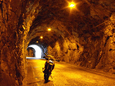 Dopo la sigaretta e le foto, devo tornar indietro, devo ripercorrere in discesa quella galleria: Prima, freno dietro tirato e frizione in mano, scendo piano piano, sentendo ogni tanto lo sterzo chiudersi leggermente...che brutto raga, anche perchè se cadevo di là non passava nessuno!!!