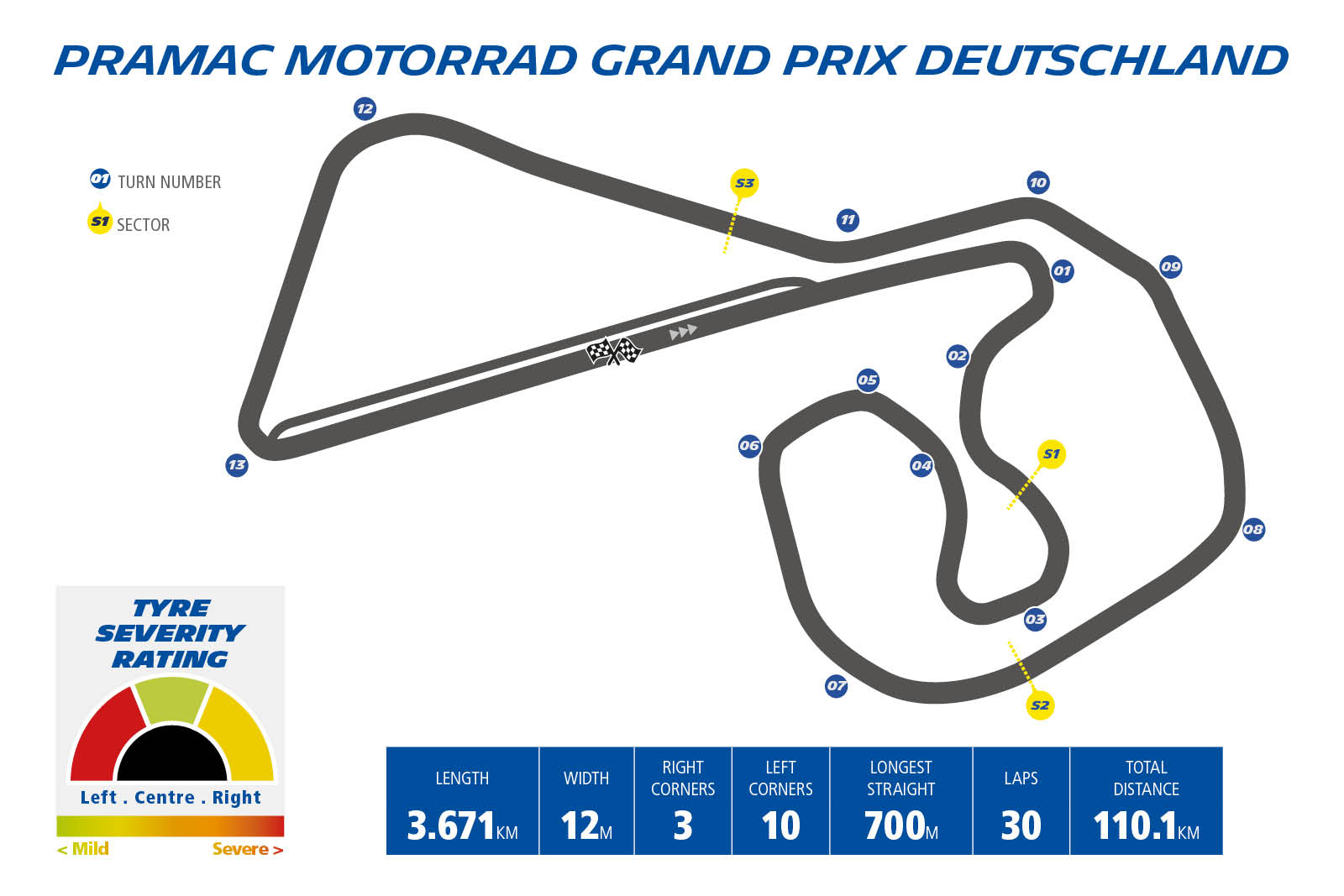 Nono appuntamento della stagione per la MotoGP che per l'occasione fa tappa in Germania, sull'atipico circuito del Sachsenring. Tracciato sinistrorso, molto corto con i suoi 3671 metri di sviluppo e che comprende 10 curve a sinistra e sole 4 curve a destra con un rettilineo principale di 800 metri.