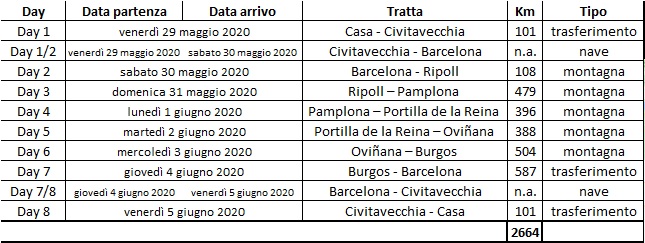 Ipotizzo: partenza da Roma e imbarco a Civitavecchia nella serata del primo giorno; pernotto a Ripoll la prima sera spagnola; sbarco la sera dell'ultimo giorno a Civitavecchia e rientro a Roma.